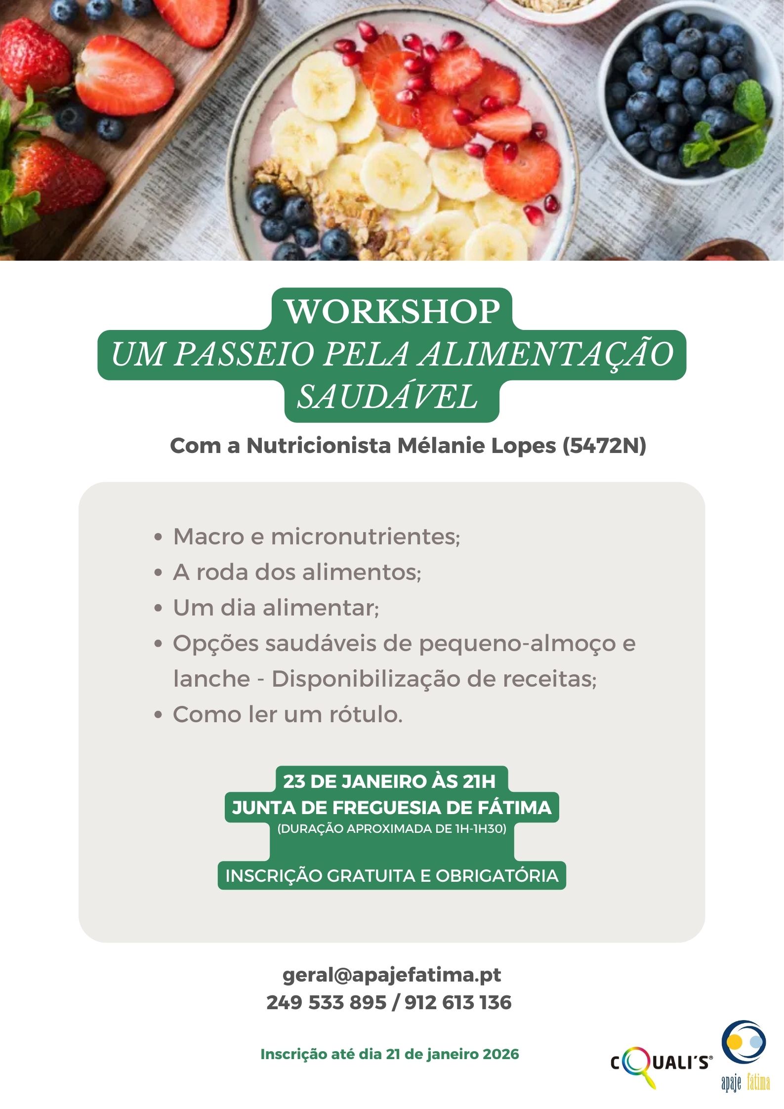 No próximo dia 23 de janeiro às 21h, venha participar no Workshop "Um passeio pela alimentação saudável" 🍎🥝🥦🥕 A Inscrição é gratuita e obrigatória. Consulte o cartaz que disponibilizamos em baixo ⬇️